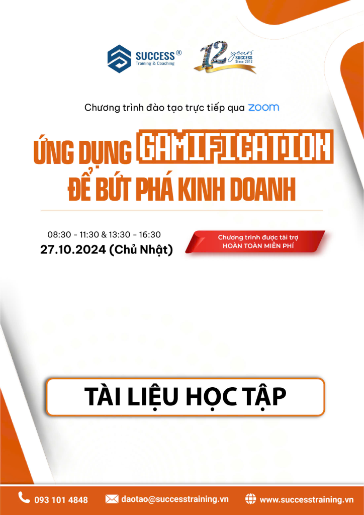 SUCCESS Training thân tặng Anh, Chị tài liệu Ebook: “Ứng Dụng Gamification Trong Kinh Doanh”. Bên trong ebook là phần tài liệu slide bài giảng của chuyên gia Andy Huỳnh Ngọc Minh đã chia sẻ trong chương trình.